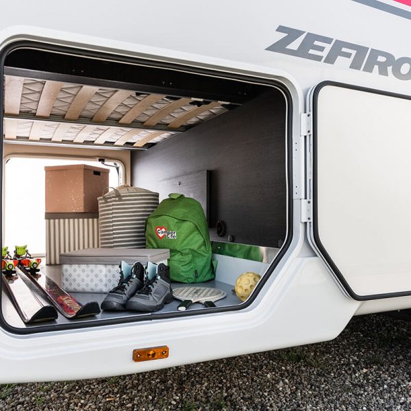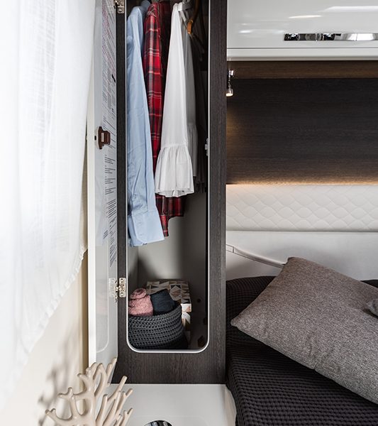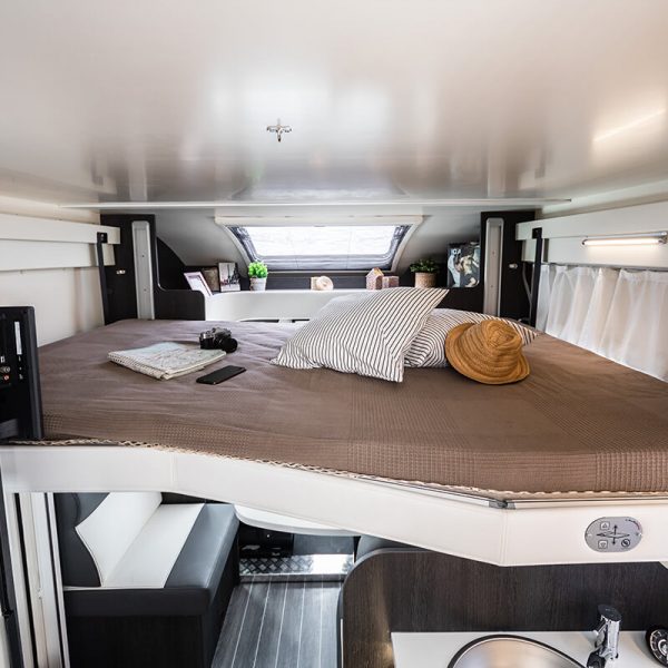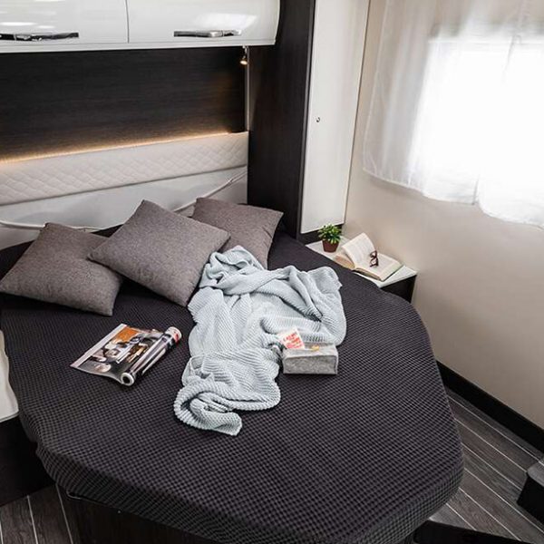 Get the five star hotel feeling in the Zefiro 696. A rear island bed with under bed storage, bedside tables and two wardrobes all closed off by a door give a level of privacy and peacefulness normally only ever dreamed of when away in a hotel. Just in front of this you’ll discover the domestic style shower cubicle separate from the remainder of the bathroom. The popular L-shaped lounge area, dressed in subtle Paola soft furnishings, creates seating for up to five people during the day, offering a homely space for relaxing and entertaining. Come night-time, a second double bed from the delicate body curves of the Zefiro 696 lowers down above the lounge using a smooth, electric mechanism.